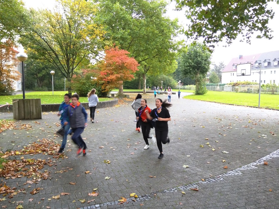 Jede Klasse hatte fünf Stationen zu durchlaufen. Hier mussten sich die Klassen als Gemeinschaft zeigen. Wer schickt möglichst viele Mitschüler sicher durch einen "Blindenparcours", zeigt sich treffsicher beim Fußball oder Basketball? Wie geschickt ist die Klasse mit dem Tennisschläger oder einen Riesen-Volleyball? Kacper Olejnik durchquerte den Parcour sogar auf Händen! Das schlechte Wetter tat der Stimmung keinen Abbruch. Überall konnte man in strahlende Gesichter blicken.